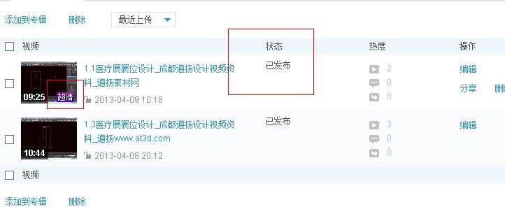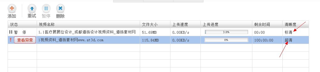 这样在添加上传文件时,就可以知道上传后,视频的清晰度了,如果是标清,就不要上传了。因为看不清楚。